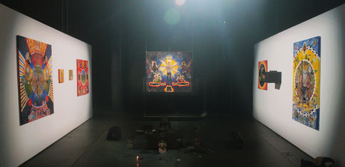 En esta pieza se condensa el espíritu de los lugares que visité, los abuelos que conocí y los saberes mágicos indígenas y mestizos que encontré. Para su activación recurro a una acción de performancia ritual que se vale de la energía condensada en las plantas de yage, tabaco y borrachero que están en las pinturas.